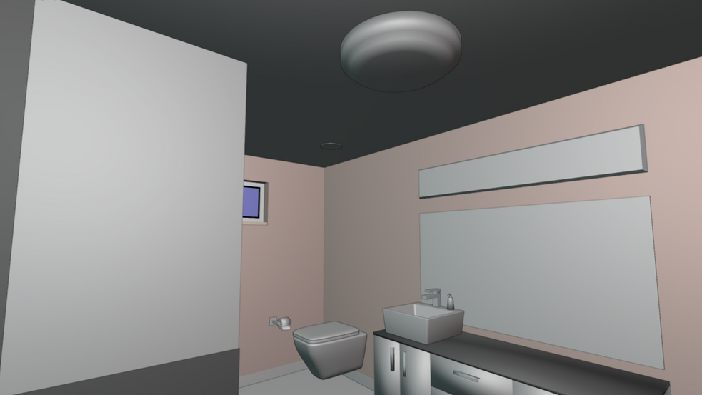A real-world scale small bathroom that contains: 1 cabinet, a marble countertop, bathtub, shower, toilet, and a sink. This scenario is ready to be used in any desired project such as gaming, cinematics, marketing, production, architecture, or interior design.